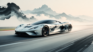 一辆水墨风格的超跑在宽阔赛道上疾驰,背景为淡雅的山水画卷,远处云雾缭绕。柔和的晨光中,光影交错在车身表面,营造出若隐若现的动感效果。低角度拍摄,从侧面略偏前方,突出车辆流线型轮廓,强调速度感和动感线条,整体氛围清新雅致,具有中国水墨画的韵味。