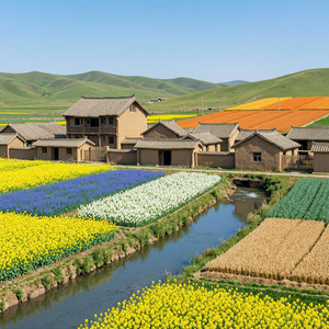 内蒙古乌兰察布土房传统大窗户小村子,山下一条小河,村外有开黄花的油菜田,开蓝花的胡麻田,开白花的土豆田,还有橘色的麦田和莜麦田,谷子田