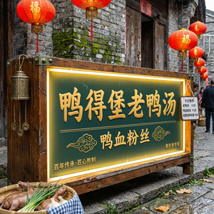 一幅生动鲜明的招牌图片,背景为传统南京巷尾的小吃街,略带复古风格,显示出历史感。柔和的暖光照亮招牌的正面,突出“鸭得堡老鸭汤·鸭血粉丝”的店名,光线自然,营造温馨氛围。光影细腻,招牌上的字体与装饰细节清晰可见,展现质感。摄影角度采用微仰俯视结合正面特写,既展示招牌整体布局,又突出品牌特色,视觉冲击力强,色彩鲜亮,具有诱人食欲感。